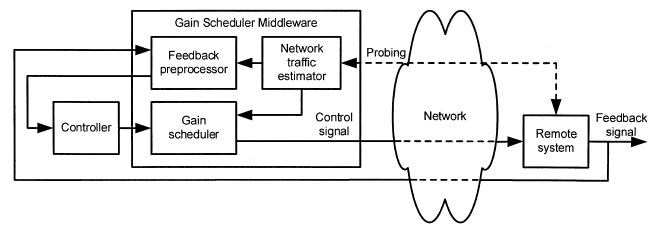 The gain scheduling middleware concept can be illustrated using the diagram below. When controlling a remote system over a network the delay caused by the network affects both the control signal and the feedback signal. When feedback arrives at the controller the feedback signals have been delayed by the network. The feedback preprocessor compensates for this by using the remote system model to predict what the feedback values will be when the next control value arrives. This preprocessed, predicted feedback is used by the controller to generate control commands. In this project the controller is a quadratic curve path tracker.